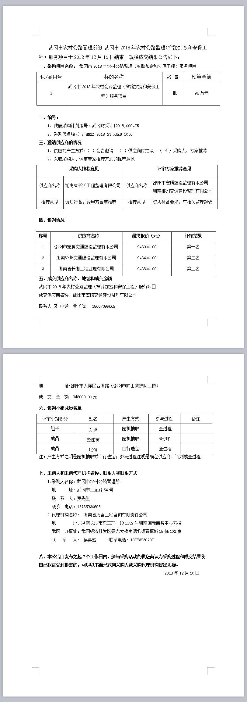 武岡市2018年農村公路監理(窄路加寬和安保工程)服務項目采購 競爭性談判成交結果公告