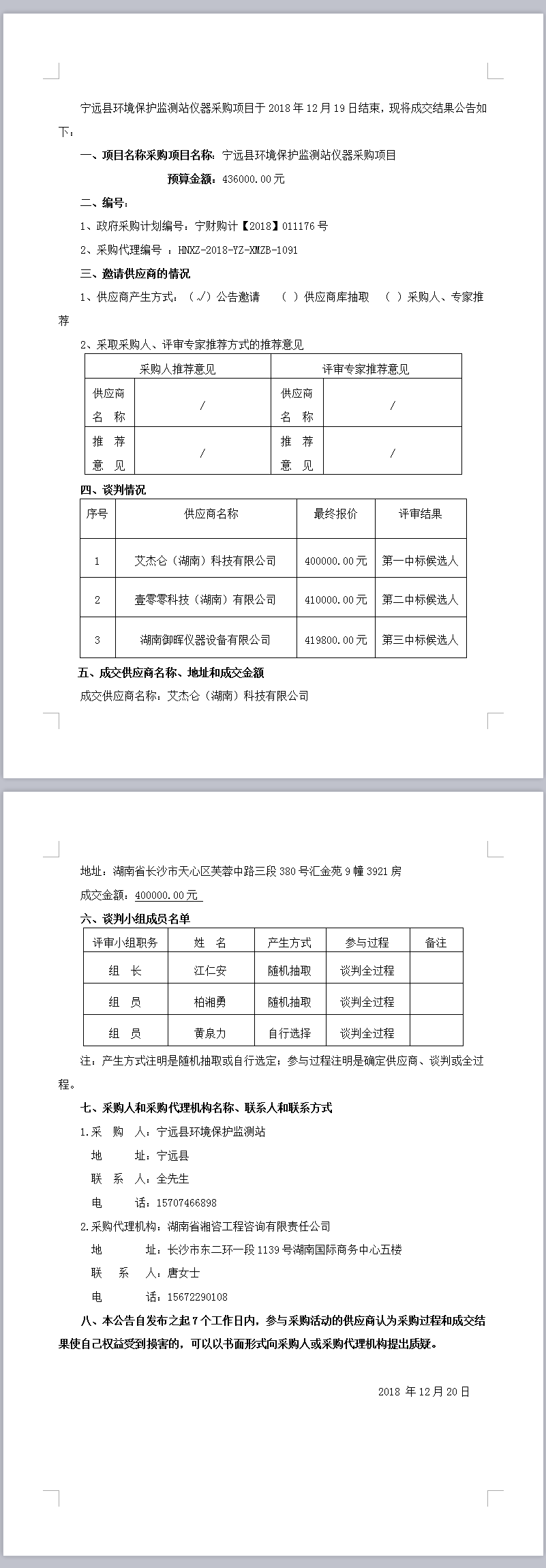 寧遠縣環境保護監測站儀器采購項目 競爭性談判成交結果公告