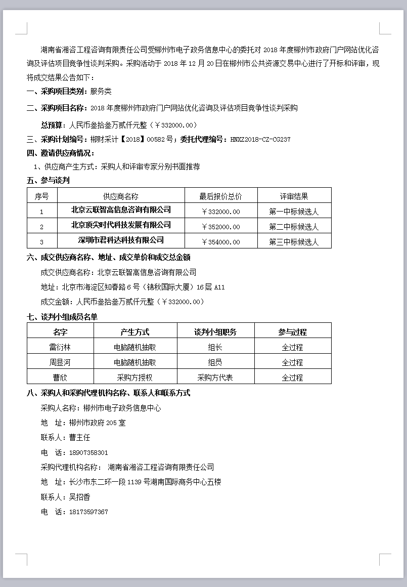 2018年度郴州市政府門戶網站優化咨詢及評估項目競爭性談判采購(第二次)成交公告