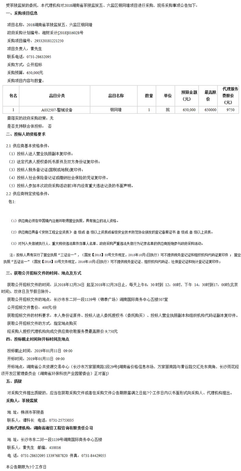 2018湖南省茶陵監獄五、六監區鋼網墻投標邀請