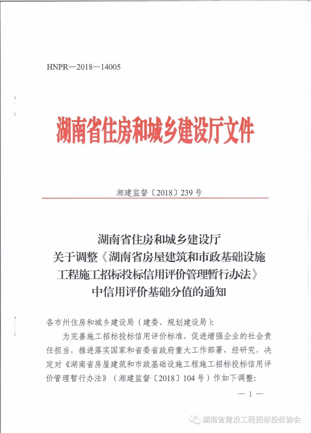 湖南省住房和城鄉建設廳關于調整《湖南省房屋建筑和市政基礎設施工程施工招標投標信用評價管理暫行辦法》中信用評價基礎分值的通知 湘建監督【2018】239號