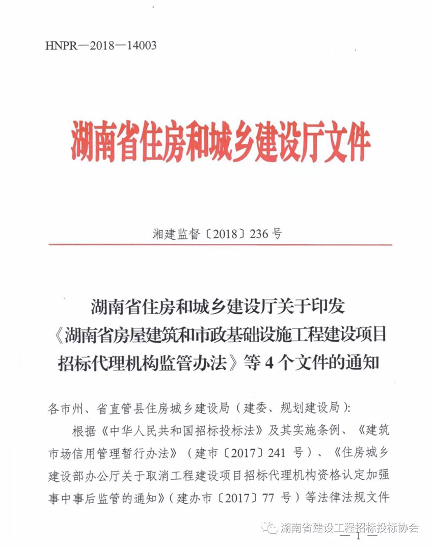 湖南省住房和城鄉建設廳關于印發《湖南省房屋建筑和市政基礎設施工程建設項目招標代理機構監管辦法》等4個文件的通知