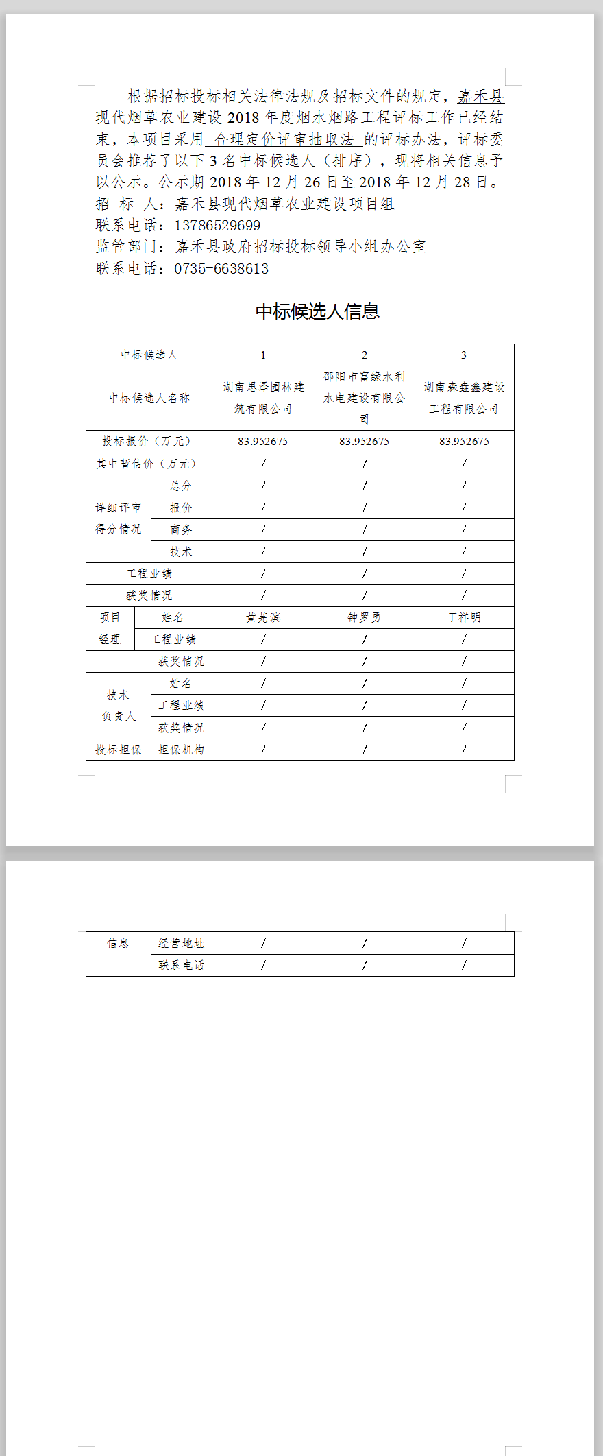 嘉禾縣現代煙草農業建設2018年度煙水煙路工程中標候選人公示