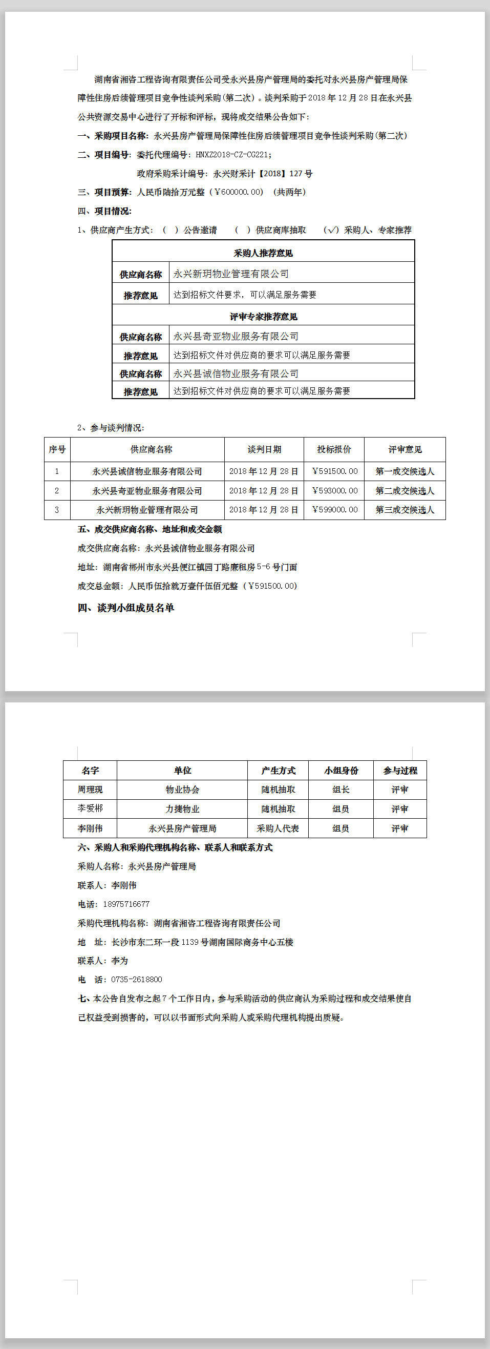 永興縣房產管理局保障性住房后續管理項目 競爭性談判采購(第二次)成交公告