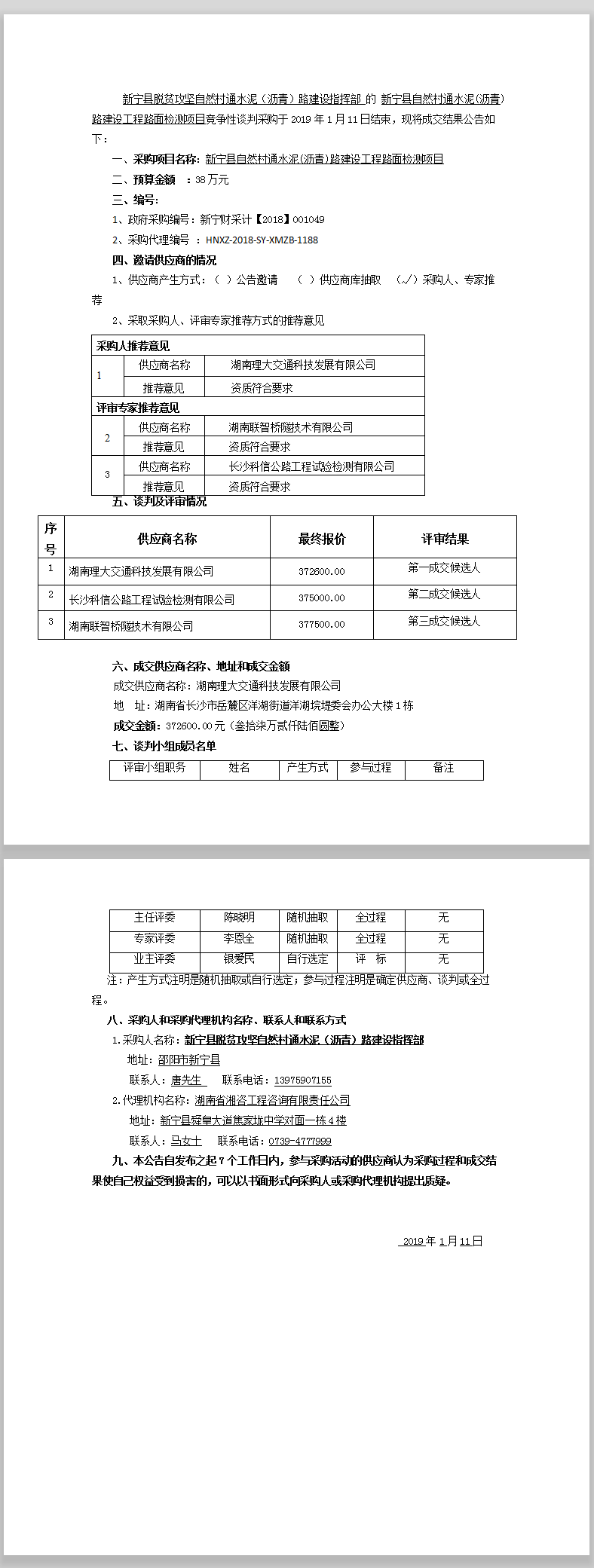 新寧縣自然村通水泥(瀝青)路建設工程路面檢測項目競爭性談判成交結果公告