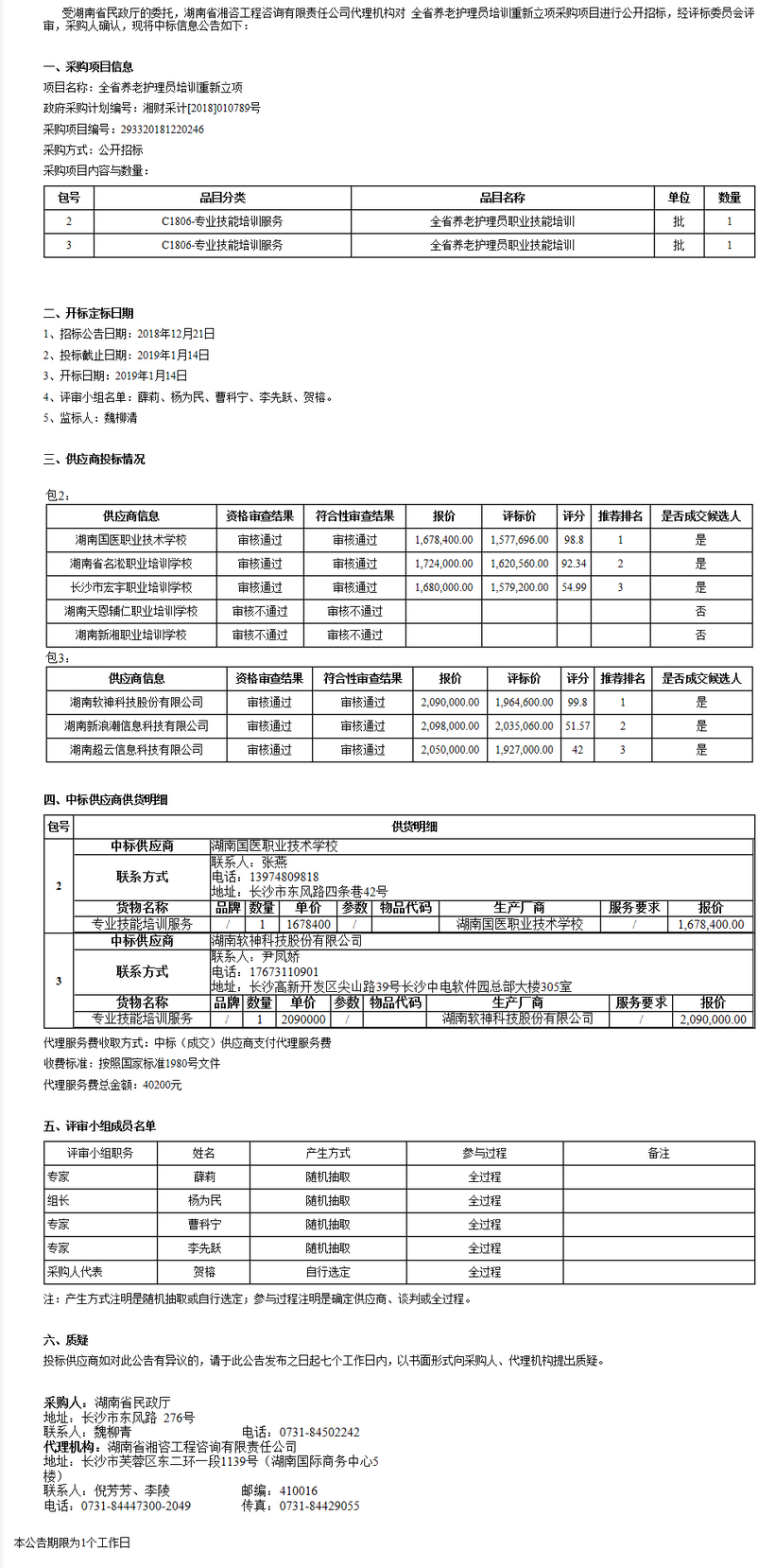 湖南省民政廳全省養老護理員培訓重新立項公開招標中標公告