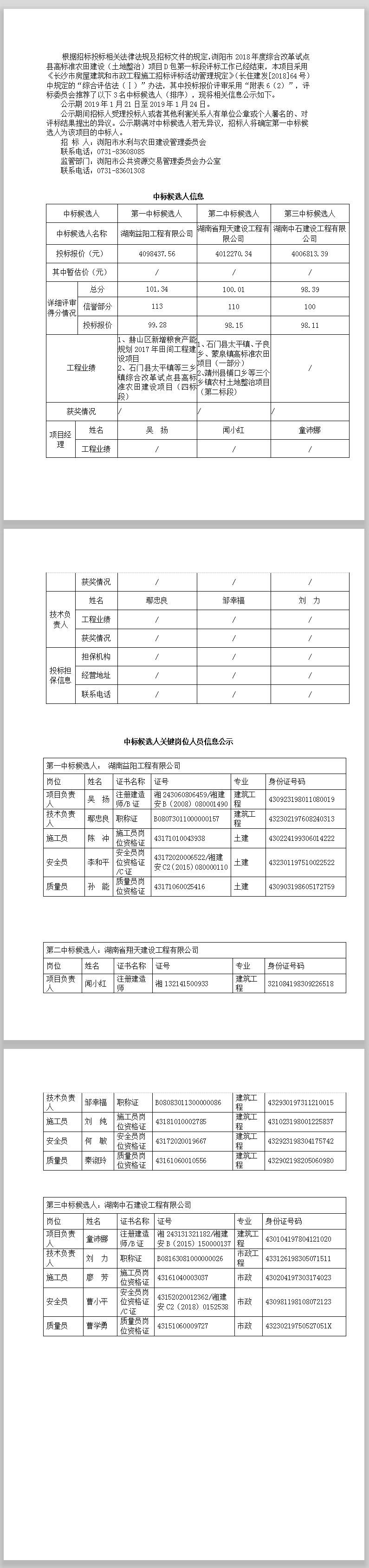 瀏陽市2018年度綜合改革試點縣高標準農(nóng)田建設(shè)(土地整治)項目D包第一標段 中標候選人公示