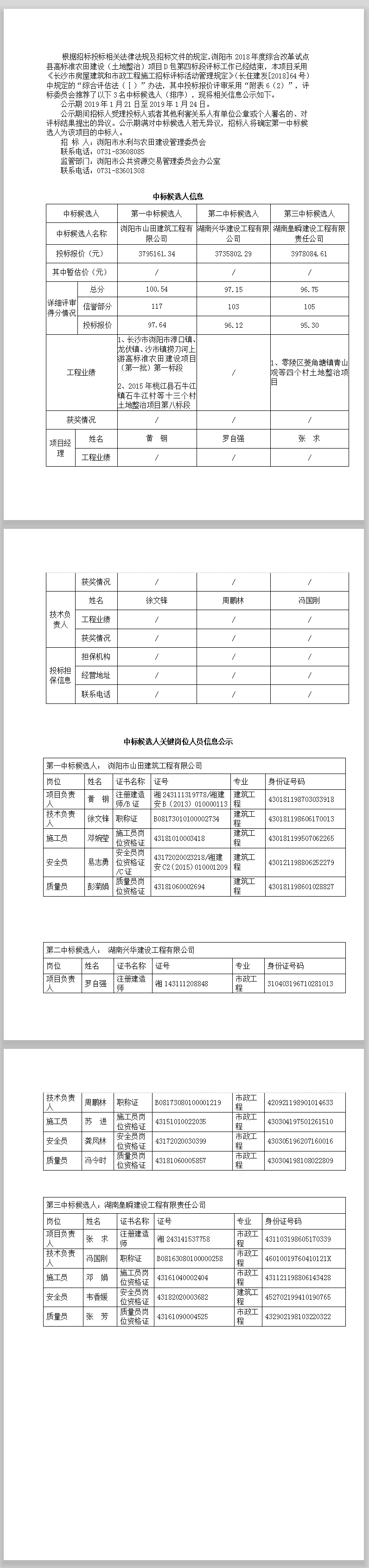 瀏陽市2018年度綜合改革試點縣高標準農田建設(土地整治)項目D包第四標段 中標候選人公示