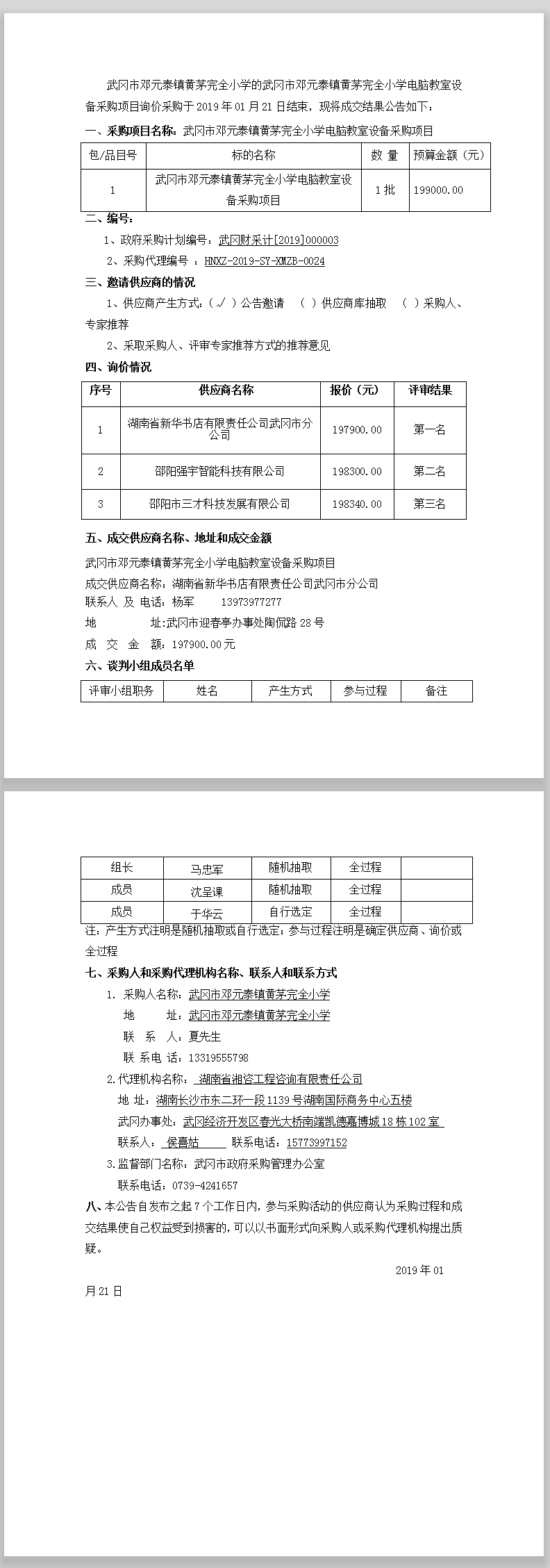 武岡市鄧元泰鎮(zhèn)黃茅完全小學(xué)電腦教室設(shè)備采購項(xiàng)目詢價(jià)成交結(jié)果公告