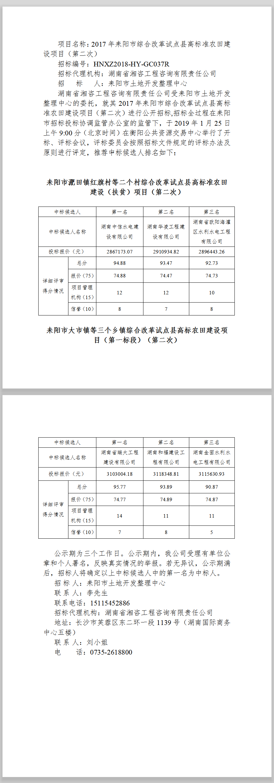 2017年耒陽市綜合改革試點縣高標準農田建設項目(第二次)中標候選人公示