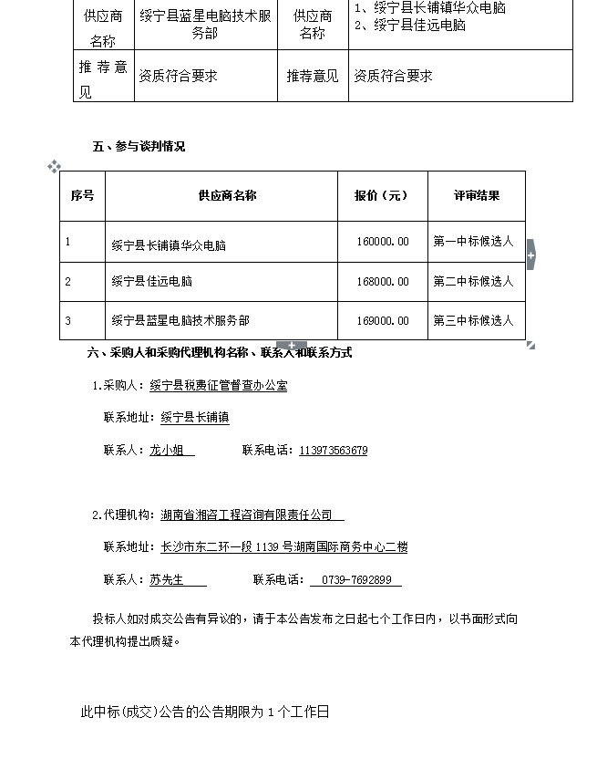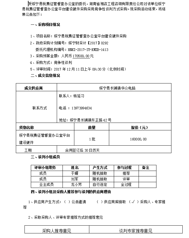 綏寧縣稅費征管督查辦公室平臺建設硬件采購談判成交公告