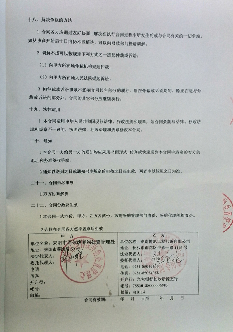 耒陽市固體廢棄物處置管理處推土機(環衛型)合同公示