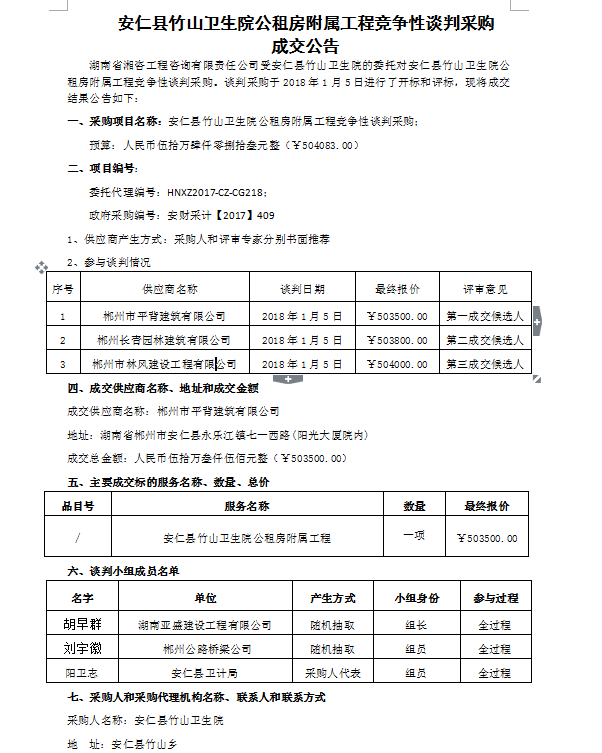 安仁縣竹山衛生院公租房附屬工程競爭性談判采購 成交公告