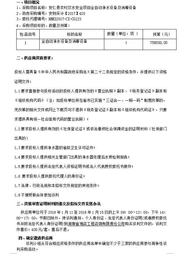安仁縣農(nóng)村飲水安全項(xiàng)目全自動(dòng)凈水設(shè)備及消毒設(shè)備談判公告