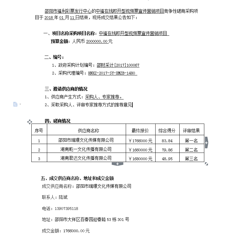 中福在線即開型視頻票宣傳營(yíng)銷項(xiàng)目 競(jìng)爭(zhēng)性磋商成交公告