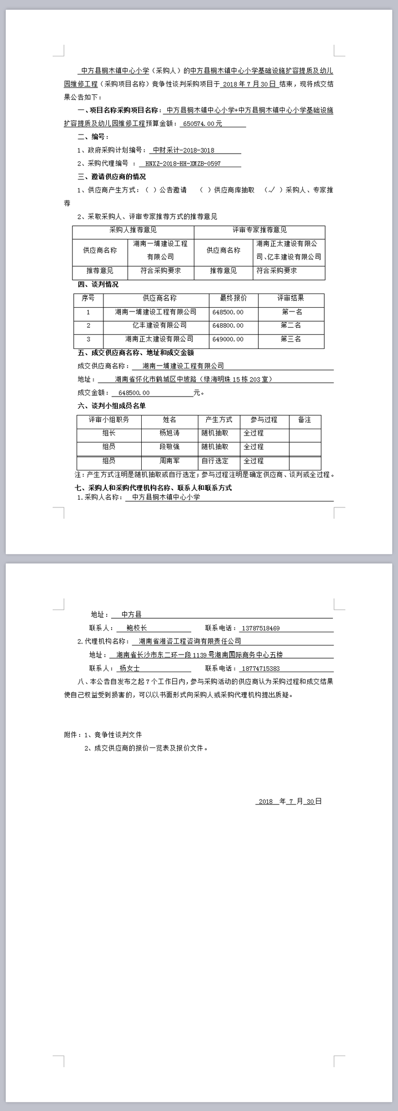 中方縣桐木鎮(zhèn)中心小學(xué)+中方縣桐木鎮(zhèn)中心小學(xué)基礎(chǔ)設(shè)施擴(kuò)容提質(zhì)及幼兒園維修工程競(jìng)爭(zhēng)性談判成交結(jié)果公告