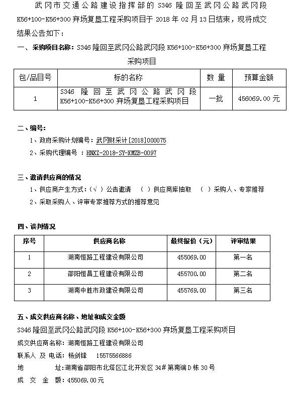 S346隆回至武岡公路武岡段K56+100-K56+300棄場復墾工程采購項目 競爭性談判成交結果公告