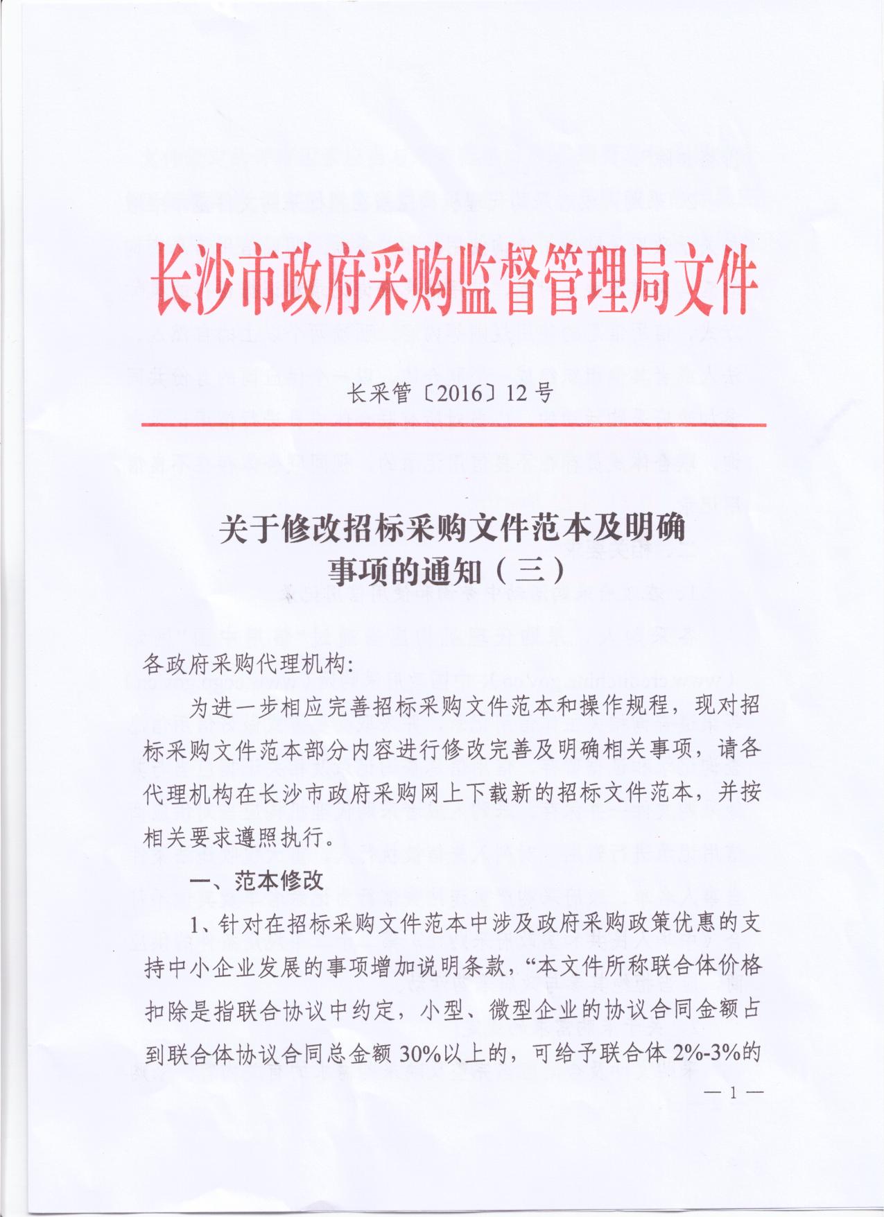關于修改招標采購文件范本及明確事項的通知(三)(長采管[2016]12號)