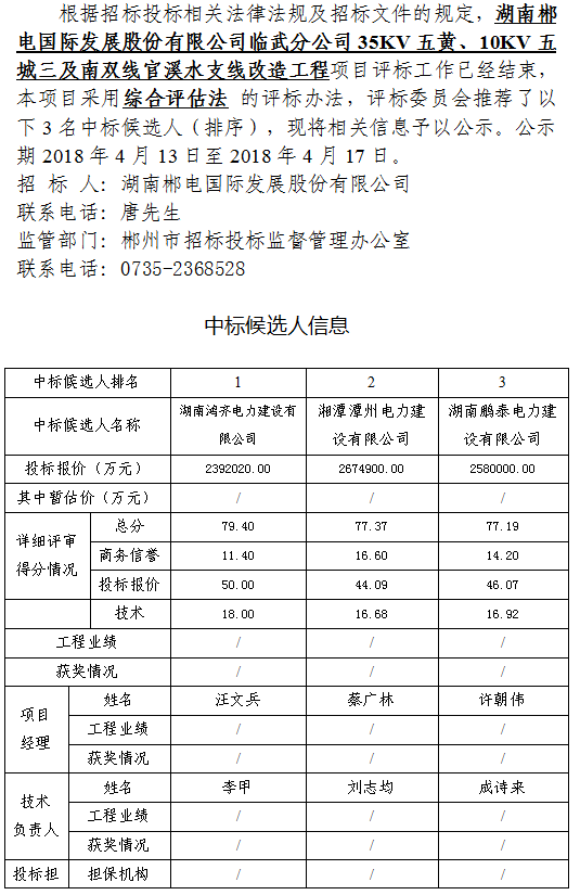 湖南郴電國際發展股份有限公司臨武分公司35KV五黃、10KV五城三及南雙線官溪水支線改造工程 中標候選人公示
