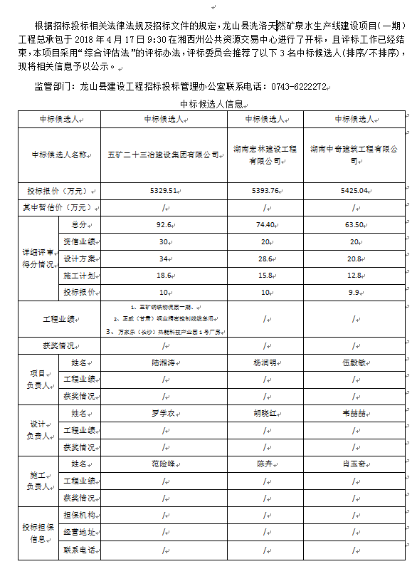 龍山縣洗洛天然礦泉水生產(chǎn)線建設(shè)項(xiàng)目(一期)工程總承包中標(biāo)候選人公示