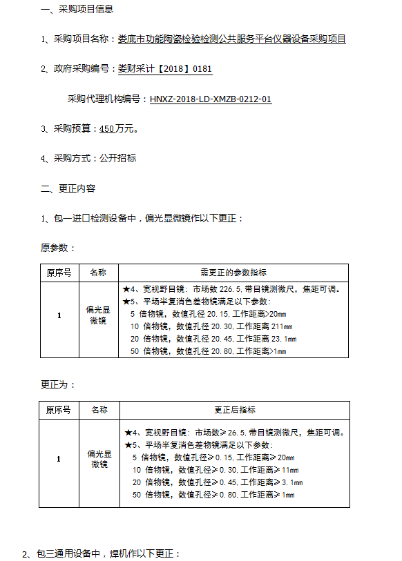 婁底市功能陶瓷檢驗檢測公共服務平臺儀器設備采購更正公告