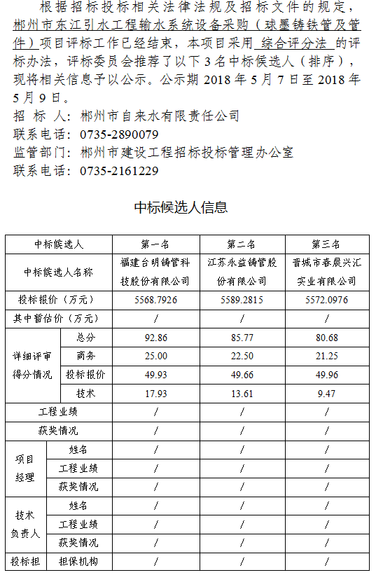 郴州市東江引水工程輸水系統(tǒng)設(shè)備采購(gòu)(球墨鑄鐵管及管件)中標(biāo)候選人公示