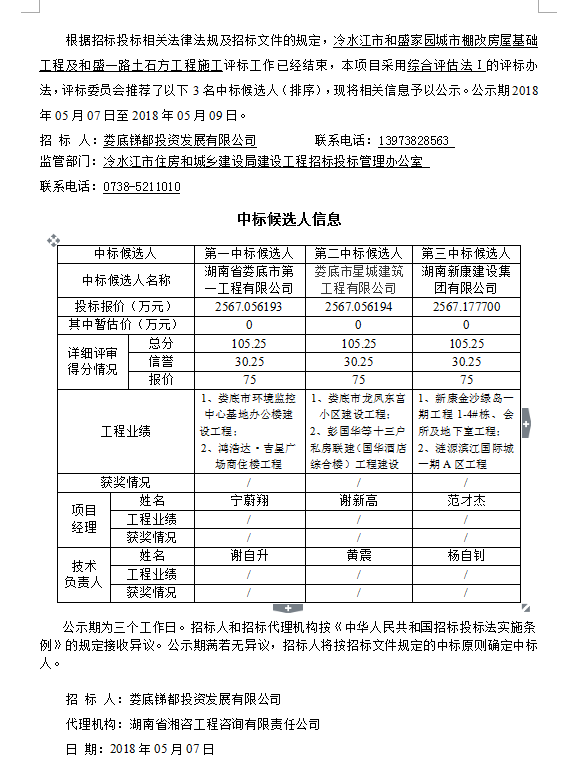 冷水江市和盛家園城市棚改房屋基礎(chǔ)工程及和盛一路土石方工程施工中標候選人公示