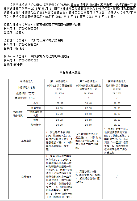 重大專項科研試驗基地項目監理二標段 招標投標信息公示表